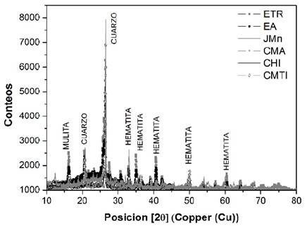 Por otro lado, mediante difracción de rayos X se logró determinar la presencia de distintas fases cristalinas en los residuos, tal como se muestra en la Fig. 1. Como resultado, se lograron identificar tres fases cristalinas principales correspondientes al cuarzo, la mulita y la hematita.