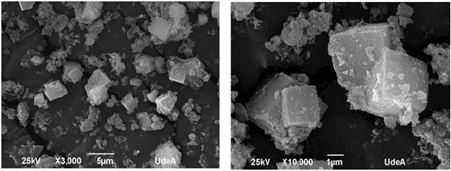 En primer lugar, la morfología del solido fue identificada por microscopia electrónica de barrido. En las microfotografías obtenidas y presentadas en las Fig 3-6, se logra evidenciar la presencia de agregados policristalinos de prismas tetragonales, y la aparición de agolomerados lefisfericos alrededor de la superficie de los prismas tetragonales, tal como se muestran en la Fig. 3 y 4. Particularmente, los aglomerados lefisfericos son característicos de las fases sodalita y cancrinita, mientras los prismas tetragonales representan una morfología típica de cristales de las fases LTA y FAU [15,16]. Además de ello en las Fig. 5 y 6, se observa un crecimiento epitaxial de una morfología cubica perfecta, característica de la fase LTA, con una interpenetración de una morfología octaédrica, característica de la fase FAU. Estos agregados son similares a los crecimientos epitaxiales entre las fases LTA y FAU descritos por varios autores [17-19].
