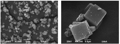 Por otra parte, la morfología de los productos sintetizados fue determinada por microscopía electrónica de barrido (SEM) en el equipo Jeol JSM-6490LV, usando como detector multielementos de estado sólido de electrón retrodisperso y una resolución de 3.0 mm. Los materiales fueron preparados por deposición del producto en un portamuestras de aluminio usando discos de carbón adhesivo recubiertos con oro para reducir la carga estática. Finalmente, el área BET y volumen de microporos de las zeolitas sintetizadas fueron determinados en un equipo Micromeritics ASAP 2020 Plus, con 100 mg de zeolita, desgasificación a 90°C por una hora y posterior calentamiento a 10°C/min hasta 350 °C por 8 horas.