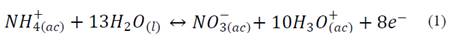 For the determination of ammoniacal nitrogen as Total Kjeldahl Nitrogen by Nessler 399 method, Hach 0875 method was used: 3 mL of the prepared solution were taken to a 25 mL volumetric flask, and then, a drop of TKN indicator was added into the flask, alongside three drops of mineral stabilizer, three drops of a dispersing agent (polyvinyl alcohol), 200 uL of 12 N potassium hydroxide and 1mL of Nessler's reagent. Distilled water was added until a 25 mL solution was obtained. The solution was then taken to the spectrophotometer.