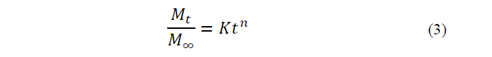 In eq 3, is the fraction of drug or fertilizer used by time t, K is the constant that marks the speed of release and n is the release exponent.