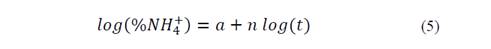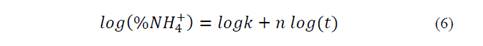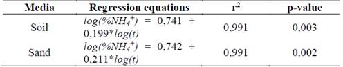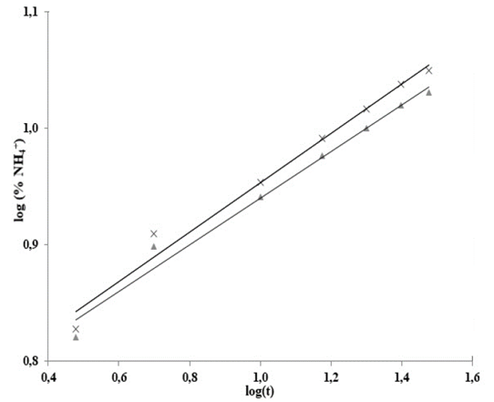 Fig. 3 shows log (% NH4 +) versus time, Table 3 shows the statistical results of NH4 + release data linearization. The data exhibits significant statistical correlation (p-value < 0.05) between log (NH4 +) and log (t), with a 95% confidence level; the correlation coefficients for the models used were larger than 0.99 -this indicates a strong correlation between variables.