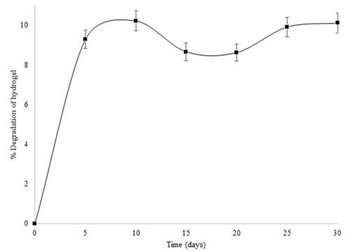 The hydrogel was cut in 1 cm x 1cm pieces. The pieces were dried at 20 °C for 48 h and weighed. Then, they were placed in distilled water (pH 6.8) for 30 days, and dried every five days at 20 °C for 48 h and weighed again. All tests were run in triplicate.