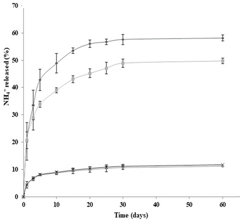 The different media did not exhibit statistical differences when hydrogel was used. Release of NH4 + after days 5, 30 and 60 was 8 ± 2 %, 11 ± 1% and 12 ± 2%, respectively. The first stage of release from the hydrogel can be attributed to the erosion of residual cellulose and polyvinyl alcohol chains as mentioned before [12]; structural loss also plays a role. According to the European Standardization Committee [13], a fertilizer is called “a controlled release fertilizer” when: