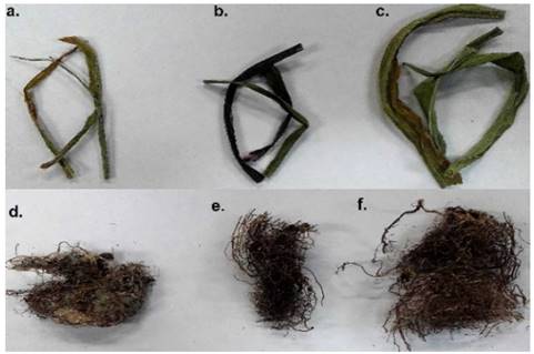 Figure 4: Zea mays parts and treatment used in greenhouse tests: a) leaf (control), b) leaf (diammonium phosphate); c). leaf (hydrogel), d) root (control), e) root (diammonium phosphate); f) root (hydrogel).