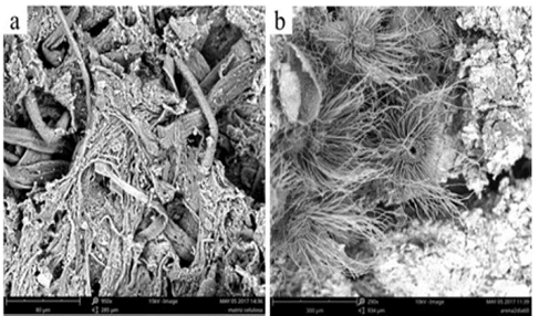 Figure 5: Scanning electron microscopy (SEM) of residual cellulose/polyvinyl alcohol hydrogel: a) before application to soil, 950x and b) 60 days after application, 290x.