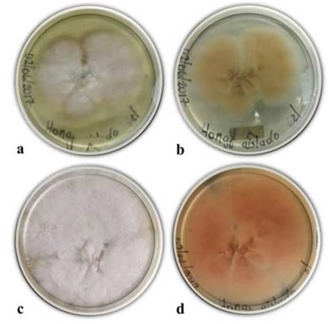 Figure 7: Development of the isolated fungus on Sabouraud agar; a) Cottony mycelia on day 6, b) Backside of the plate on day 6, c) Cottony mycelia on day 10 and d) Backside of the plate on day 10.
