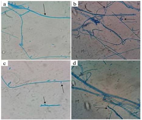 Fig. 8 shows images (at 40x) of the culture plates in lactophenol blue. On the images we observe the fungus’ mycelium, composed of thin septate hyaline hyphae (Fig. 8a), lateral phialides (Fig. 8b), oval and ellipsoidal microconidia and ascospores (Figs. 8c and 8d) [22]. The macroscopic and microscopic taxonomic characters identified in the fungal isolate match those of Fusarium spp.