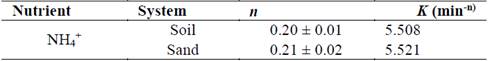 During the first five days of evaluation, diammonium phosphate released 43 ± 2 % and 34 ± 2 % of NH4 + in soil and sand matrices, respectively. The high solubility of diammonium phosphate in water (57.5 g / 100 mL at 10ºC) produced this rapid release (called Tigger effect). On day 30, NH4 + release reached levels of 58 ± 2 % and 48 ± 1 %; these data are similar to those found on day 60 -this indicated that migration of NH4 + from the fertilizer to the soil matrix had reached equilibrium. During the evaluation period, larger concentrations of NH4 + were found in solutions obtained from soil (pH 4.8), than in those obtained from sand (pH 7.2); this was to be expected as pH was an essential factor in determining the solubility of nutrients in soil, where NH4 +, NO3 -, CO3 2- and SiO3 2- displayed a larger displacement of oxidation equilibria (nitrification and denitrification), and also dissociation of NH4 + ions (eq. 1 and 2) to the left side of the equation, increasing the concentration of NH4 + ions in the soil solution and favoringleaching [11]. In addition, the soil exchange complex displays a lower pH, which increases protonation at the points of exchange; this translates into positive charging of the colloidal mycelia, avoiding adsorption of NH4 + on the surface.