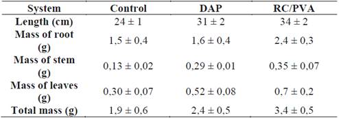 Table 5 shows the aver age heights of the hydrogel-treated plants and the diammonium phosphate-treated plants; p > 0.05 suggests there are no significant differences in the treatments. However, both treatments are significantly different from the control group. The mass of the plants grown in hydrogel-fertilized soil was larger than that of diammonium phosphate-fertilized plants; these findings show the positive effects of hydrogel-fertilized soil on the bioindicator. The results shown confirm that nitrogen fertilizers can be optimized, averaging lower production costs and reducing environmental impact produced by traditional fertilization processes [21].
