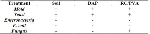 After 60 days, we isolated (in 4 % Glucose Sabouraud agar) from hydrogel-fertilized soil, a fungus with the same characteristics as those found on the hydrogel’s surface. None of the tests performed revealed the presence of enterobacteria or E. coli (both regulated by Colombian legislation and the National Health Institute).
