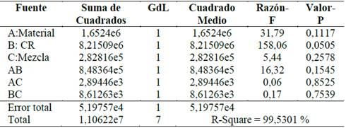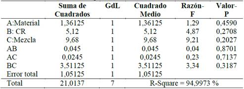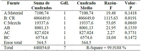 Después de procesar las respuestas de los 8 ensayos realizados para cada prueba, el resumen de los resultados se presenta en la Tabla 3. El análisis estadístico de los resultados del diseño de experimentos (DOE), explicado en esta sección, se realiza utilizando el programa computacional Statgraphics®, tomando cada variable de respuesta (consumo de combustible, variación de revoluciones, emisiones de escape y tiempo de calentamiento del motor en ralentí) en función de los factores (RC, material de la culata y composición del combustible). El análisis utiliza la tabla de análisis de varianza (ANOVA), el gráfico de Pareto, la media cuadrática y las superficies de respuesta. Se consideró un p-valor de 0,05 para la valoración de los factores estadísticamente significativos.