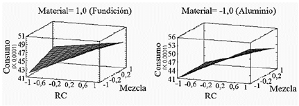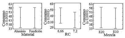 En las gráficas de medias de la Fig. 3, con respecto al material de la culata y la composición del combustible, se observa que las medias correspondientes de consumo de combustible son muy cercanas. Para el factor de RC, hay una ligera diferencia en las medias de consumo.