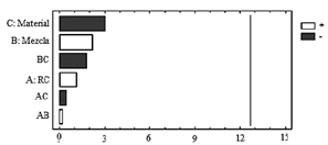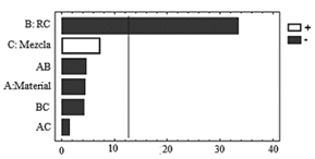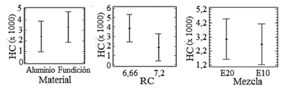 Análisis de emisiones de hidrocarburos. El análisis de varianza para hidrocarburos se presenta en la Tabla 8. Se observan diferencias significativas en el factor de RC, seguido por el factor de material de la culata y la interacción de estos dos factores. El diagrama de Pareto de la Fig. 14, confirma la fuerte influencia de la RC en las emisiones de HC. A diferencia del diagrama de Pareto para el CO2, la composición de la mezcla ejerce cierta influencia en los niveles de emisiones HC no quemadas. Incrementando el contenido de etanol en la mezcla, las emisiones de HC se disminuyen considerablemente en condiciones de ralentí.