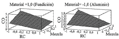 Las superficies de respuesta de las emisiones de CO como funciones de la RC y mezclas de combustible dejando fijo el factor material de culata, se muestran en la Fig. 10, donde la dependencia entre los niveles de emisiones de CO y el contenido de etanol en el combustible es lineal. A un nivel alto de la RC, cuanto mayor sea el contenido de etanol, menores serán los niveles de emisión de CO. Para el nivel bajo de la RC, la influencia del contenido de etanol no es definida cuando se usa la culata de aluminio. En general, a partir de las superficies de respuesta, se puede concluir que con la culata de hierro fundido los niveles de emisiones de CO son mayores que con la de aluminio. Esto podría atribuirse a la reducción de la transferencia de calor de la culata, que genera una reducción en la eficiencia volumétrica y, por consiguiente, en el contenido de aire de la mezcla.