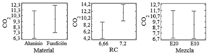Observando los diagramas de medias de la Fig. 12, se puede concluir que los valores altos de CO2 son producidos con la mayor RC (un incremento cercano al 32% en las emisiones de CO2, para un cambio de 6,6 a 7,2). El incremento de emisiones de CO2 se debe a una mejor combustión.