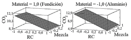 Análisis de dióxido de carbono. A partir de la tabla de varianza, Tabla 7, y del diagrama de Pareto de la Fig. 11, se observa que el mayor efecto sobre las emisiones de CO2 se da con la RC, seguido del material de la culata y la interacción de estos dos factores.