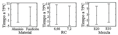 En la Fig. 19, se muestran los diagramas de medias del tiempo de calentamiento. A partir de ellos, se puede observar que la temperatura de calentamiento de 75ºC se alcanza primero en el motor con culata de hierro fundido y luego en el de aluminio. En ambos casos, la presencia de etanol y el incremento de la RC mejoran la combustión y el tiempo de calentamiento del motor disminuye. Las temperaturas de estado estacionario del motor bajan con el aumento de la RC, con la mayor conductividad del material y con el mayor contenido de etanol. Las diferencias de temperatura de estado estacionario con el cambio de E10 a E20 son mayores cuando el material es de mayor conductividad térmica.