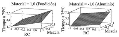 En la Fig. 20 se tienen las superficies de respuesta del tiempo de calentamiento. El calentamiento más lento se realiza con la combinación de culata de aluminio, menor RC y mezcla E10. El motor tiene el calentamiento más rápido, 1,7375 min, con la culata de fundición, RC 7,2 y mezcla combustible E20.