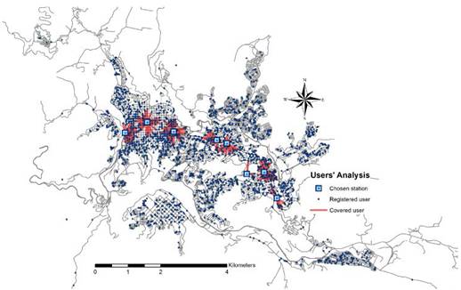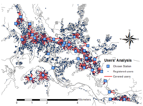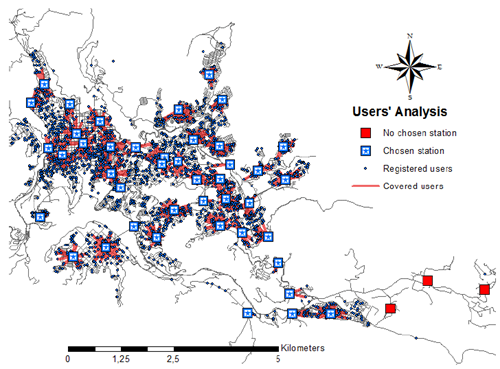 Fig. 6 presents the results of the location-allocation problem for the current situation. It shows that users are almost uniformly distributed throughout the city. However, there are not many people within 500 meters of the stations. The system works for around 698 of the 3,314 registered users, which represents only 21.06% of users who were registered by June 2016 who have an average of 332 meters to get to any station. Those 698 users represent 0.17% of the city’s total population. If only 0.17% of population are registered, the system has no efficient coverage, and it needs to be improved.