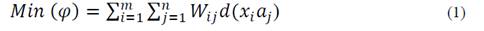 The eq. (1) resumes the formulation of the location-allocation problem, where Wij is the quantity supplied to customer j by facility i; d(xi,aj) is the distance between a customer j and a new facility i; xi are the coordinates of the new facilities i=1, 2, …., m.
