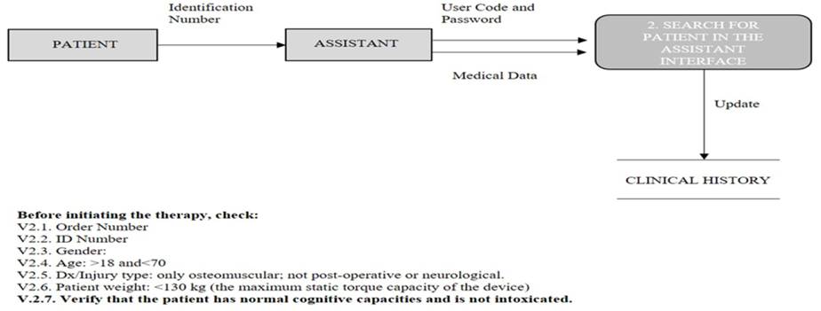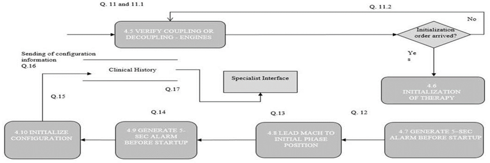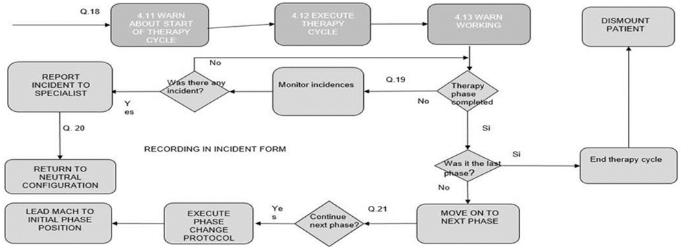 At this point, the assistive device is ready and in optimal condition to start operating. The patient has accepted the therapy protocol, and the assistant is ready to start the therapy session once the initialization order issued by the specialist arrives (Question 11.2). The assistive device performs the initial specification or evaluation to establish the range of motion, speed and force tolerated by the patient, and the rehabilitation process begins. These specifications are recorded in the patient’s clinical history.