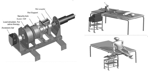 Teleoperated assistive device: This prototype was designed by a group of engineers with differente specialties for knee rehabilitation. A computer establishes the duration of the therapy (from 1- 240 min), the speed (from 30 to 150 °/min), maximum extension/maximum flexion (from -10 to 140°) and the duration of the movement change delay (from 0 to 30 s).