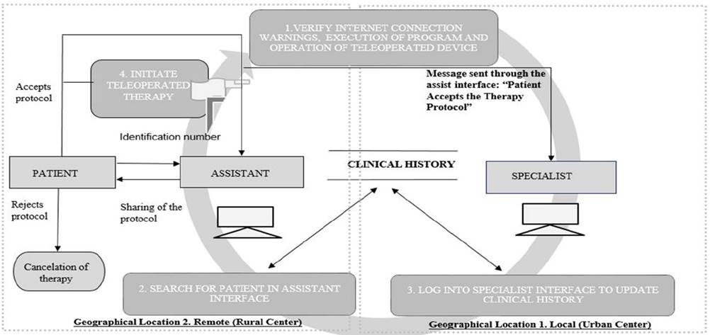 The first activity establishes the internet communication between the two geographical locations. Then, via interface, the assistant (remotely located) registers the patient with his or her identification number, searches his or her clinical history and informs the specialist (local), about the therapy session that is about to begin. Through the interface, the specialist consults the clinical history of the patient and assigns the therapy routine. This information is updated in the assistant interface, and the assistant then informs the patient about the rehabilitation process that will be performed. Then, the patient decides whether to accept the therapy process. If accepted, the therapy session starts; otherwise, the therapy session is canceled.