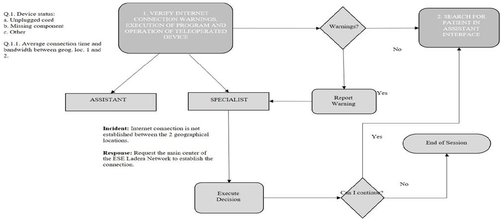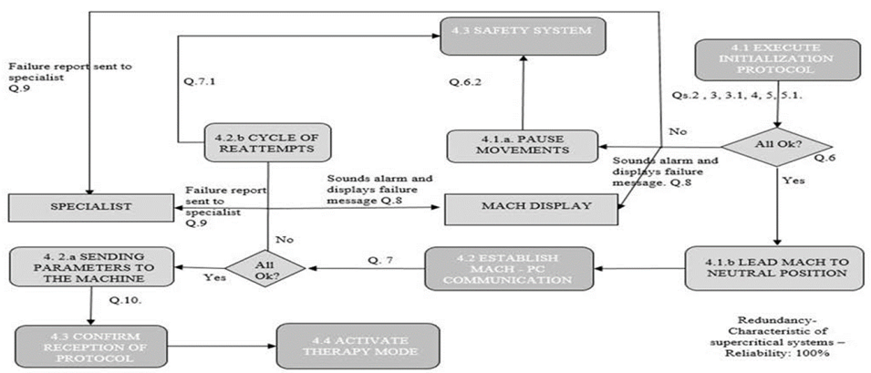 After the teleoperated therapy is accepted by the patient, the assistant follows the machine initialization protocol (Fig. 6) and checks the operational conditions with the help of the checklist, answering the following questions: