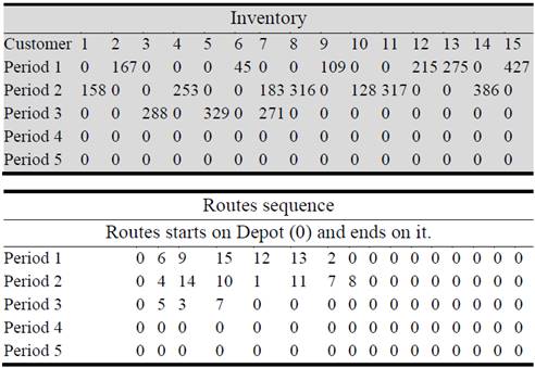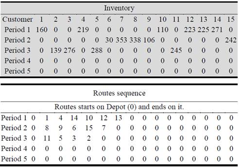 The IRP model, in which transport and inventory costs are added, generates a distribution process in which is not necessary to supply all the customers in all the periods. This produces a decrease in transport costs generated by an increase in inventory costs. The distribution plan that is generated from the best individual of the genetic algorithm used to solve the model is presented in figure 1. In the gray part is shown the inventory quantity that must be delivery to each of the customers, while in the unlabeled part the distribution sequence is presented.