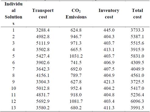 The multiobjective model, in which the transport, inventory and CO2 emission costs are analyzed separately, generates a set of individuals similar to those presented in figures 1 and 2. The set of individuals are produced by the non-dominance of the solutions, so it is not possible to argue that one solution is better than another and for that reason the decision maker, depending on his preference, can take any of the individuals solutions produced by the model. Table 2 presents the results for the 3 optimized objective functions, and includes a column adding the inventory and transport cost.