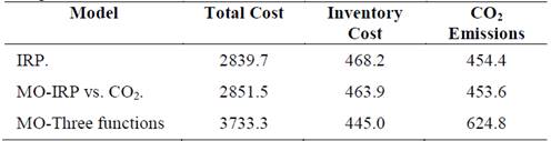 From the results presented in Table 3, it is possible to observe that the total cost, inventory and CO2 emissions for the IRP and multiobjective IRP vs. CO2 are very similar, but differ with the solution that produced the fewer emissions in the three-function multiobjective model. This is caused by the reduction of the inventory costs, due to the three-function multiobjective algorithm generates solutions that somehow represent the best conditions for each of the objective functions, this way producing solutions with smaller inventory quantities but generating higher transport costs and CO2 emissions.