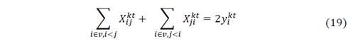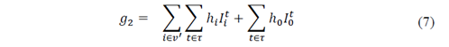 The first term is the sum of the inventory costs, which is obtained by multiplying the holding cost h 𝑖 by the amount of product 𝐼 𝑖 𝑡 hold in every time t for every customer i. The second term is the inventory costs at the supplier facility represented with the sub index 0. Transport costs are calculated by multiplying the transport costs 𝑐 𝑖𝑗 of traveling from node i to j by the binary variable 𝑥 𝑖𝑗 𝑘𝑡 which is equal to 1 if the vehicle k travel from I to j in the period t and zero otherwise. The set v includes all the nodes of the problem and 𝑣 ′ only includes the customers’ nodes.