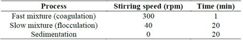 The clarification tests (coagulation - flocculation - sedimentation) were performed in jar test devices according to the recommendations of [15] and [16] (Table 1); the experimental unit corresponded to a two-liter acrylic jar. Ferric chloride (FeCl3) was used as coagulant due to its high use in DWTPs [17,18]; a constant coagulant dose (22 mg/L) was determined from previous jar tests.