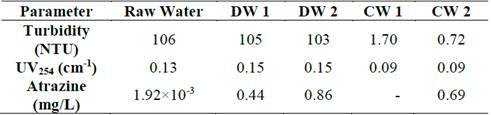 Table 2 presents the turbidity, UV254 and atrazine concentration of raw water, atrazine-doped water and clarified water.