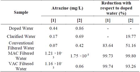 To determine the reduction of atrazine, its concentration was measured in raw water (1.92 × 10-3 mg/L), in water doped with the two pesticide concentrations, and at the end of each of the following processes: clarification (coagulation - flocculation - sedimentation), conventional filtration and GAC filtration (MAC and VAC). Table 4 presents the concentrations and the reduction percentages in the different processes.
