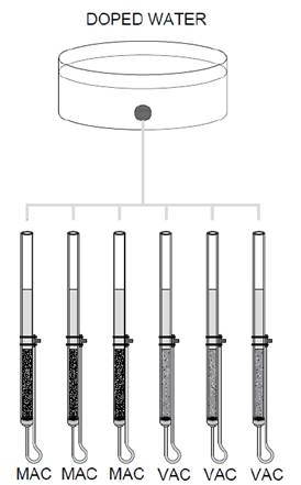 The experiments were performed in triplicate using three experimental units for each adsorbent medium (MAC and VAC) and atrazine concentration, resulting in a total of 12 experimental units. A flow distribution system and a constant load tank were used for the dosing of the conventional filtered water. Figure 2 shows the experimental configuration for one concentration.