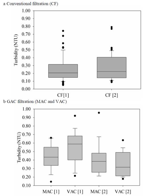 Figure 3 shows a box-plot of the turbidity results of the conventional and GAC filtrations for the two concentrations used.
