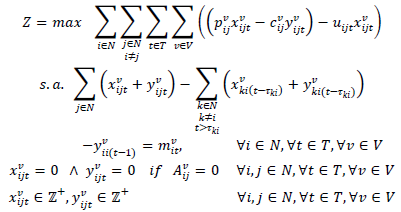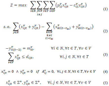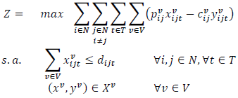 Las decisiones a ser tomadas en el PAV implican determinar cuáles cargas son aceptadas y cuales son rechazadas entre los diferentes terminales, además de definir el reposicionamiento de vehículos vacíos entre terminales para atender la demanda futura. A seguir, el PAV es modelado como en [9,10], el cual es una extensión de un problema de flujo multicommodity de costo mínimo en un grafo direccionado de espacio-tiempo, para el caso en que todas las demandas son conocidas a priori. Este problema es conocido por pertenecer al grupo de problemas NP-hard [12].