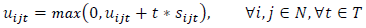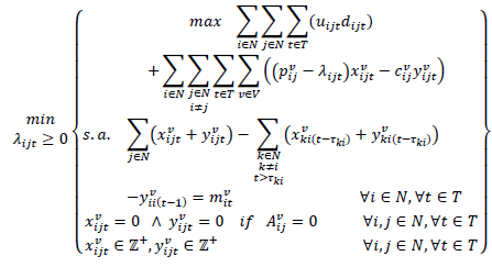 Note que dados uijt, el problema (6)-(10) puede ser fácilmente resuelto utilizando algún algoritmo que aproveche la estructura en red del problema de flujo. La solución del problema (6)-(10) puede o no, proporcionar soluciones factibles para el problema original (1)-(5). Puesto que el problema lagranjeano resultante (6)-(10) es un problema de flujo de costo máximo en una red extendida de espacio-tiempo, este posee la propiedad de integralidad. Esto implica que la mejor cota superior producido por el problema lagranjeano (6)-(10) para el problema (1)-(5) no es mejor que la cota superior obtenida por la relajación lineal del problema original. Considerando que se quiere encontrar valores para los multiplicadores lagranjeanos que minimicen la cota superior, el problema dual lagranjeano corresponde a: