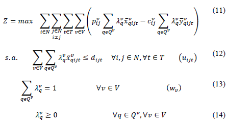 En esta sección se presenta la descomposición de Dantzig-Wolfe y el método de generación de columnas. Iniciando con la decomposición, observe que las restricciones de flujo (2) y restricción de movimiento (4) pueden ser agrupadas de acuerdo a cada tipo de vehículo. De esta manera, tomando las restricciones de atendimiento a la demanda (3) como restricciones de acoplamiento, las demás pueden ser agrupadas en conjuntos Xv para todo vЄV, dados por:
