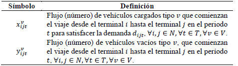 La función objetivo (1) maximiza el lucro total de las operaciones a lo largo del horizonte de planeación, que equivale al ingreso generado por el desplazamiento de vehículos cargado menos los costos de desplazamiento de vehículos vacíos. El conjunto de restricciones (2) garantiza el equilibrio de flujo de vehículos cargados y vehículos vacíos en cada terminal i, periodo 𝑡 y vehículo tipo v. El conjunto de restricciones (3) establece una cota superior equivalente a la demanda del número de vehículos en cada arco (i,j,t). El conjunto de restricciones (4) establece las rutas permitidas para vehículos cargados y vacíos. Estas restricciones son relevantes desde el punto de vista práctico, pues permiten que ciertos tipos de vehículos realicen ciertas rutas, sea por seguridad de las carreteras, restricciones impuestas en el contrato de los conductores, entre otros. Finalmente, el conjunto de restricciones (5) imponen el dominio de las variables de decisión.