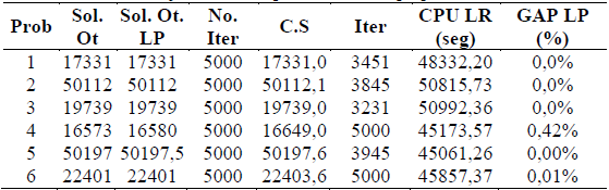 Inicialmente fueron tomados 6 ejemplares de 15 terminales, 15 periodos de tiempo y 15 tipos de vehículos, para testar la viabilidad de los métodos en problemas mayores. La Tabla 4 muestra los resultados referentes al subgradiente de optimización. Las columnas se refieren a: nombre del problema (Prob); número de iteraciones de la ejecución (No. Iter.); valor óptimo del problema (Sol. Ot); valor óptimo de la relajación lineal (Sol. Ot. LP); cota superior obtenida con el subgradiente de optimización (C.S); número de la iteración en que la cota de la relajación lagranjeana alcanza la cota de la relajación lineal (Iter); tiempo de ejecución de las 5000 iteraciones, en segundos (CPU LR (seg)); porcentaje de desviación entre la cota superior y la solución óptima de la relajación lineal (GAP LP (%)).