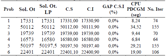 La Tabla 5 muestra los resultados referentes a la GC primal-dual. Las primeras tres columnas son iguales a la Tabla 4, y las restantes se refieren a: cota superior obtenida con la GC primal-dual (C.S); cota inferior obtenida con la GC primal-dual (C.I); porcentaje de desviación entre las cotas de la GC primal-dual (GAP C.S.I (%)); tiempo de ejecución de la GC primal-dual, en segundos (CPU PDCGM (seg)); total de iteraciones de la GC primal-dual (No. Iter).