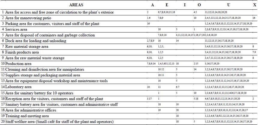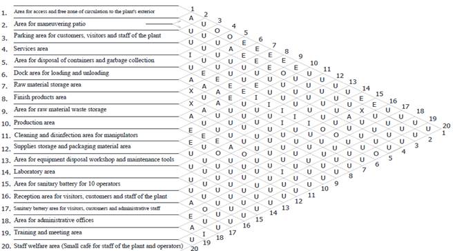 This diagram shows the relationships that exist or not between all the areas of the industrial installation according to their level of importance of being close or not; in order to represent the relationships of the areas in a logical manner and to classify the intensity of these relationships, it employs the relational diagram of areas, which consists in representing the proximity needs between each area and the rest according to some defined proximity factors which are represented by a letter code, following a scale that decreases in the order of the five vowels: A (absolutely necessary), E (especially important), I (important), O (Ordinarily important) and U (Unimportant); the undesirability is represented by the letter X.