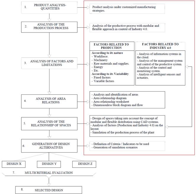 Below, in Fig.1 the scheme of the proposed methodology is shown. This methodology consists of 8 stages to guide the designer to take the most accurate decisions when facing the problem of plant distribution, the phases indicated in the red box show the approach of The Industry 4.0.