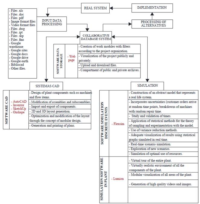 The proposed methodology has incorporated into its structure the so-called integrated system design see Fig.2 which is based on collaborative systems, relationship of design software, simulation and data systems in the cloud as a database. The appropriate use of these tools can save costs and time because of the imitation of the real model through a computer model before it is definitely built. The right use of these tools from the first to the last phase of the methodology will allow achieving a project according to the real system for its subsequent implementation.