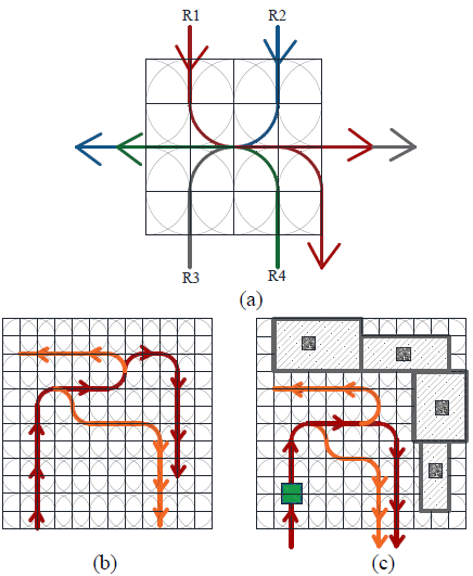 Figure. 6: Representation of route flows for transport and maintenance systems. a) Flexible route design, b) Flexible layout design, c) Flexible route design in an area with equipment and machinery.