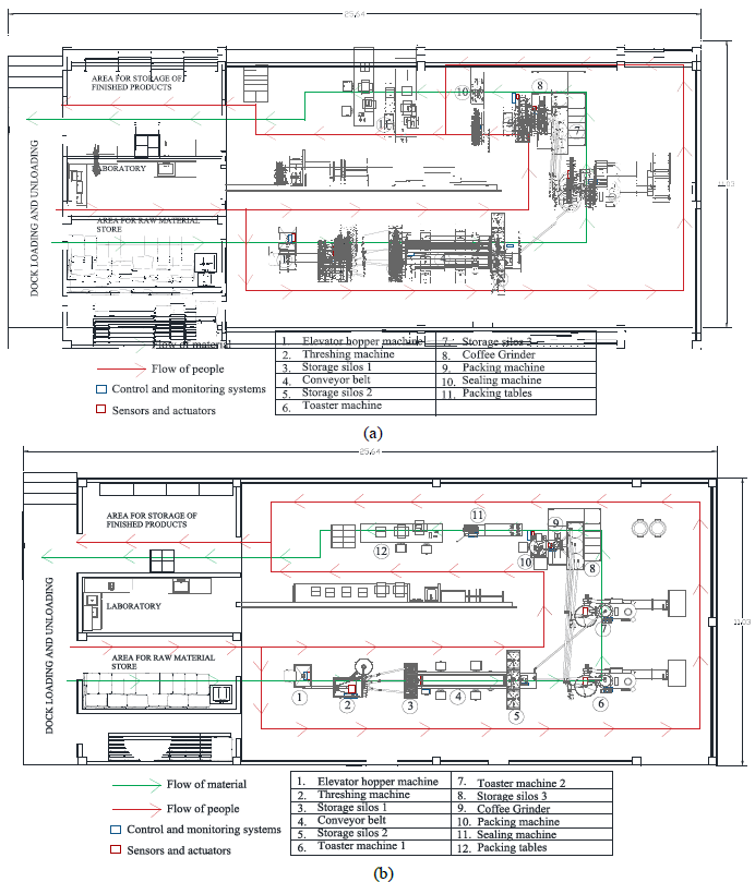 Figure. 8: Distribution alternatives for the coffee processing plant. a) Layout alternatives 1, b) Layout alternative 2.