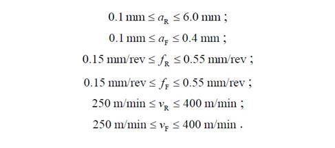 El proceso de torneado se ejecutará en un torno CNC, el cual tiene un motor de 10 kW y una eficiencia en la transmisión del 75%. La fuerza máxima permisible por la máquina herramienta es de 5000 N. El radio de la punta tanto para la herramienta de desbaste como para la de acabado es de 2 mm. Los rangos permisibles de los parámetros de corte para la herramienta seleccionada se muestran a continuación. Cabe destacar que como la herramienta para el desbaste y el acabado es la misma, el avance y la velocidad se mantienen igual para ambas operaciones.